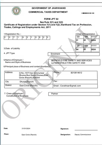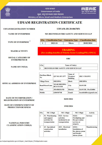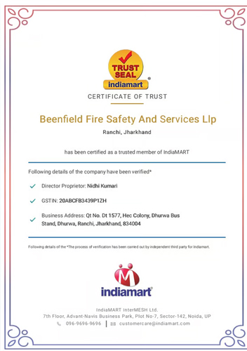 “Company Established In The Year 2012 At Rachi, Jharkhand. Beenfield Fire Safety And Services Company Certified With :-